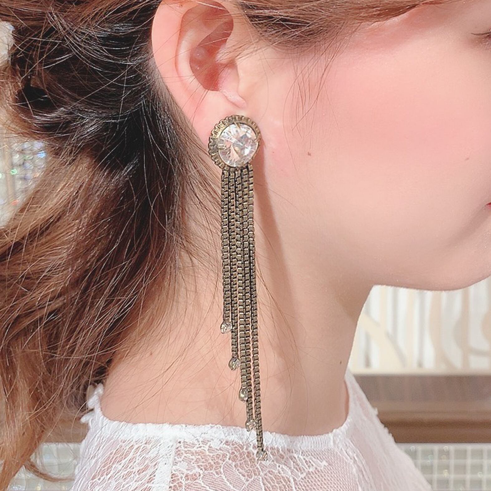 こちらのアイテムは、大きくて丸い形のスワロフスキーとフリンジが特徴的なユニークなデザインのイヤリングです。