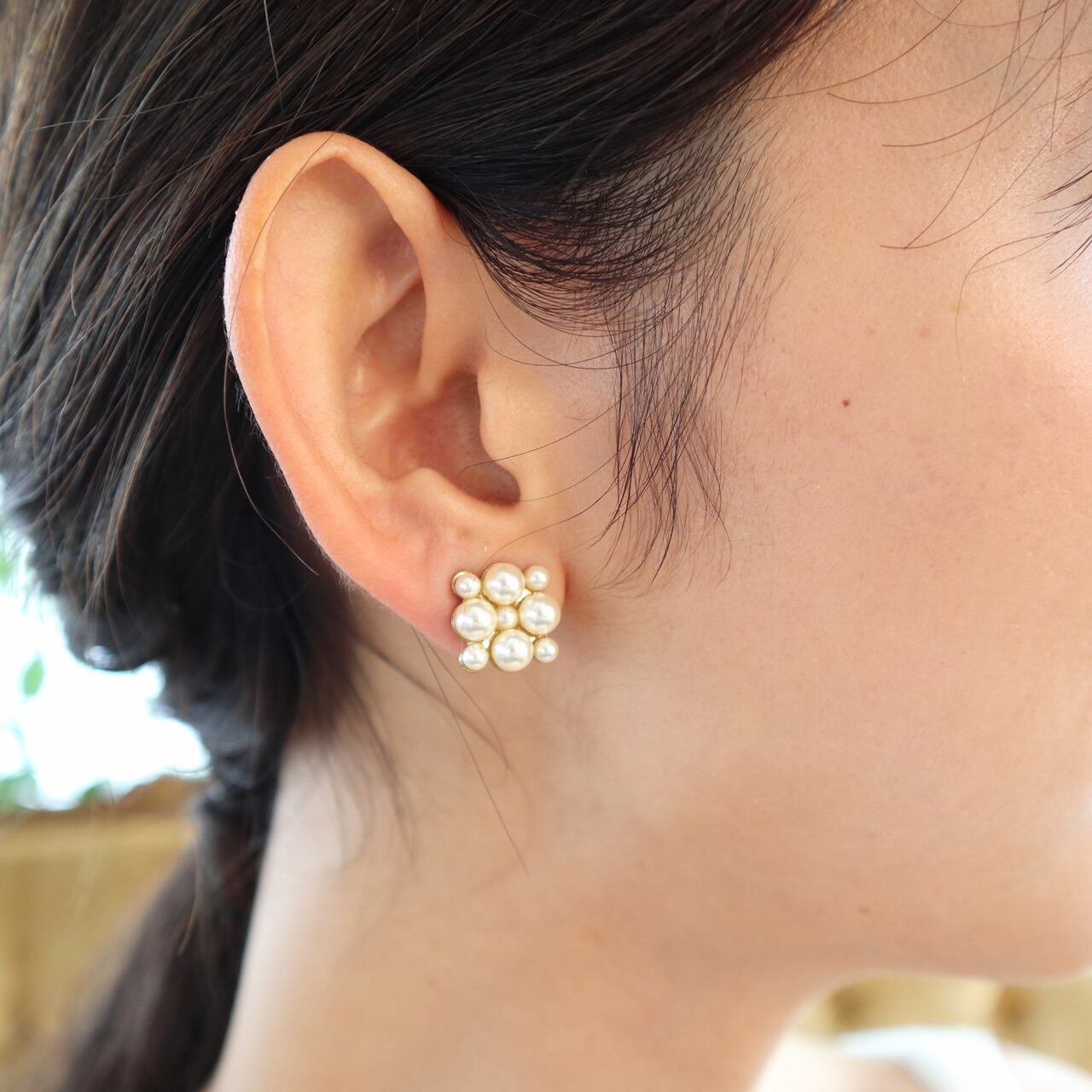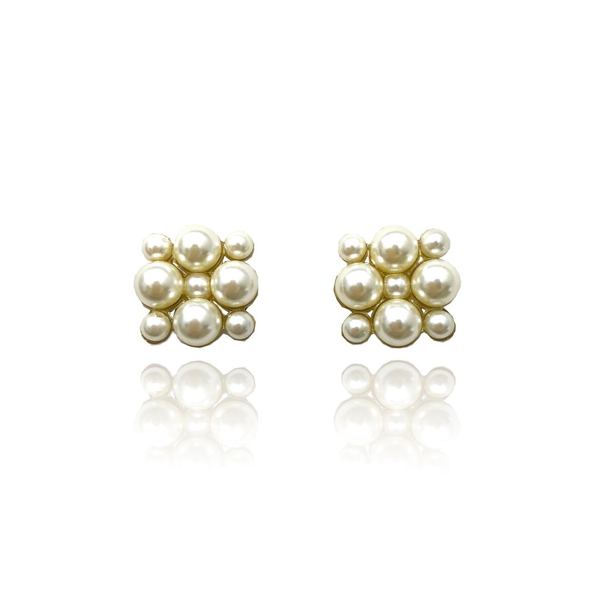 こちらのアイテムはサイズの違うパールを組み合わせた正方形のイヤリングです。