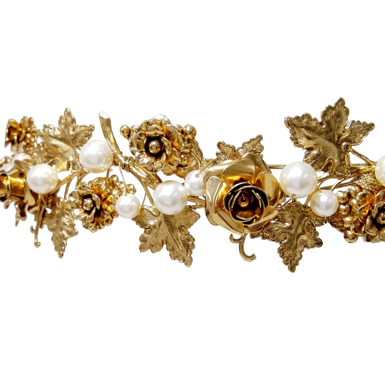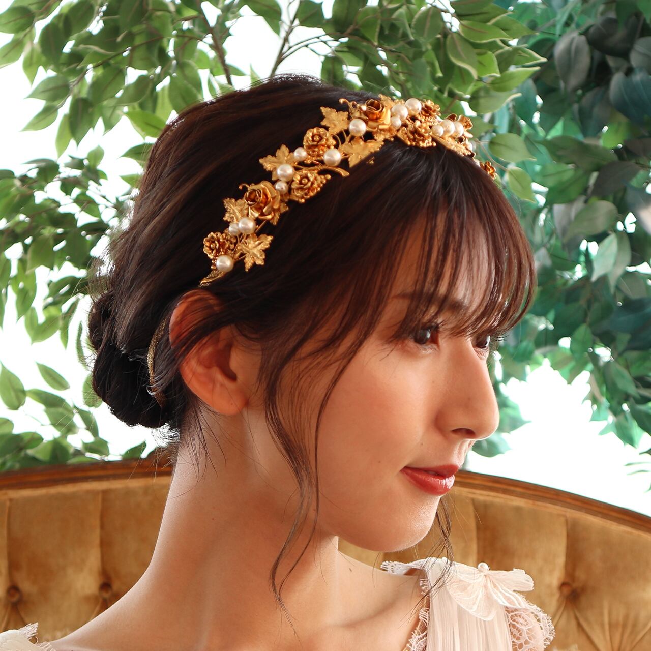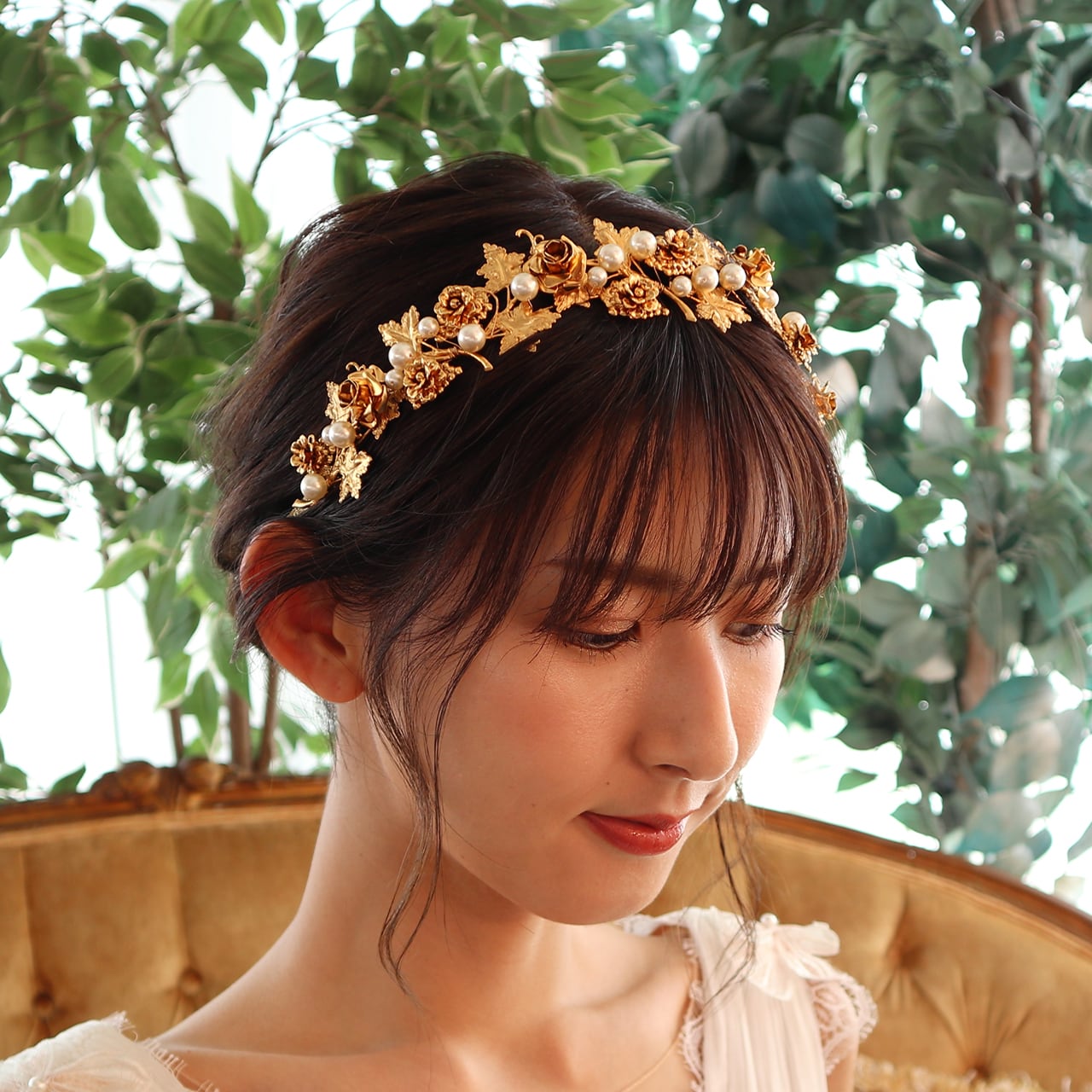 こちらのアイテムはローズ・カメリアなどのフラワーとリーフモチーフを組み合わせたアイテムです。 パールを追加する事で、ゴールドに華を添えデザインを引き締めてくれています。