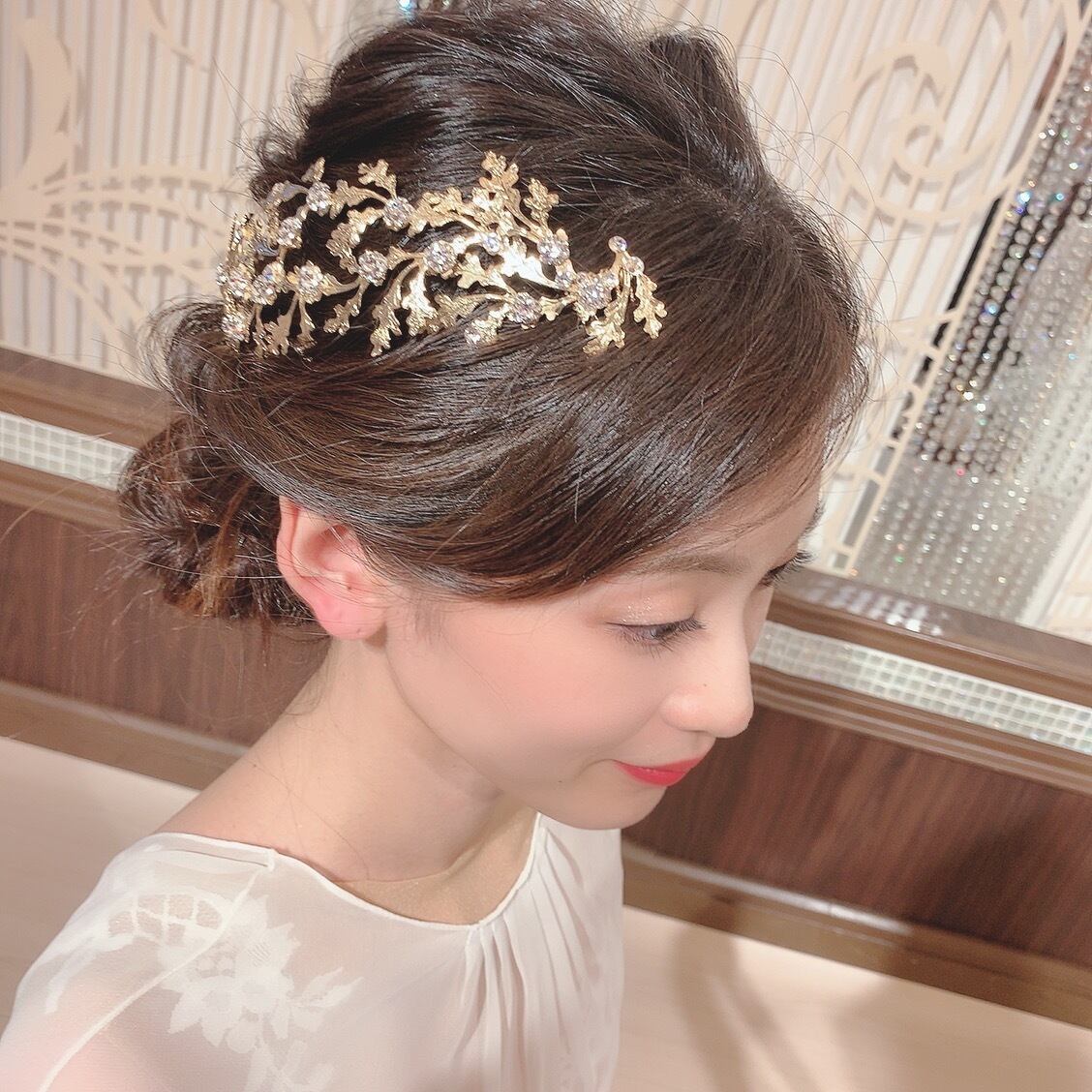ヘアスタイルはアレンジしたアップヘアに最適です。