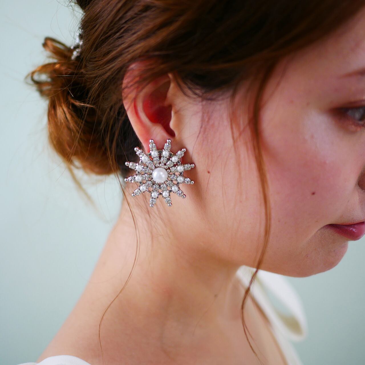 こちらのアイテムは、インパクトのあるデザインにパールをマッチさせたボタンイヤリングです。向日葵のような・太陽のような独特なデザインは、AUDENワールドならではのユニークさが表現されています。